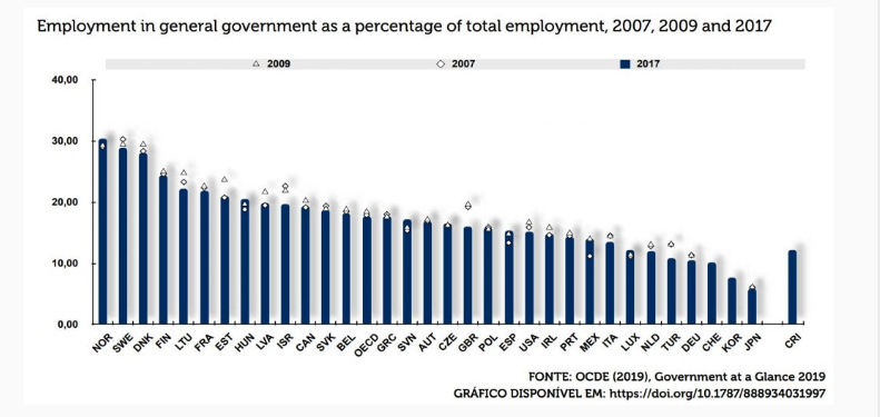 O Brasil figura, conforme aponta a OCDE com uma taxa de 12.5% de servidores públicos em relação à população empregada. Fica demonstrado que o Brasil está muito abaixo da média da OCDE para esse indicador, que é para esse mesmo período, já de 22.0%. O Brasil está praticamente na média do indicador para a América Latina + Caribe, que é de 12.3%.[2]