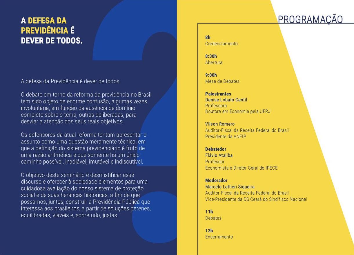 O seminário terá como palestrantes a professora Denise Lobato Gentil (doutora em Economia pela Universidade Federal do Rio de Janeiro - UFRJ) e o Auditor-Fiscal da Receita Federal do Brasil, Vilson Romero (presidente da Associação Nacional dos Auditores Fiscais da Receita Federal do Brasil - ANFIP). O professor e economista Flávio Ataliba (diretor geral do Instituto de Pesquisa e Estratégia Econômica do Ceará - IPECE) atuará como debatedor.