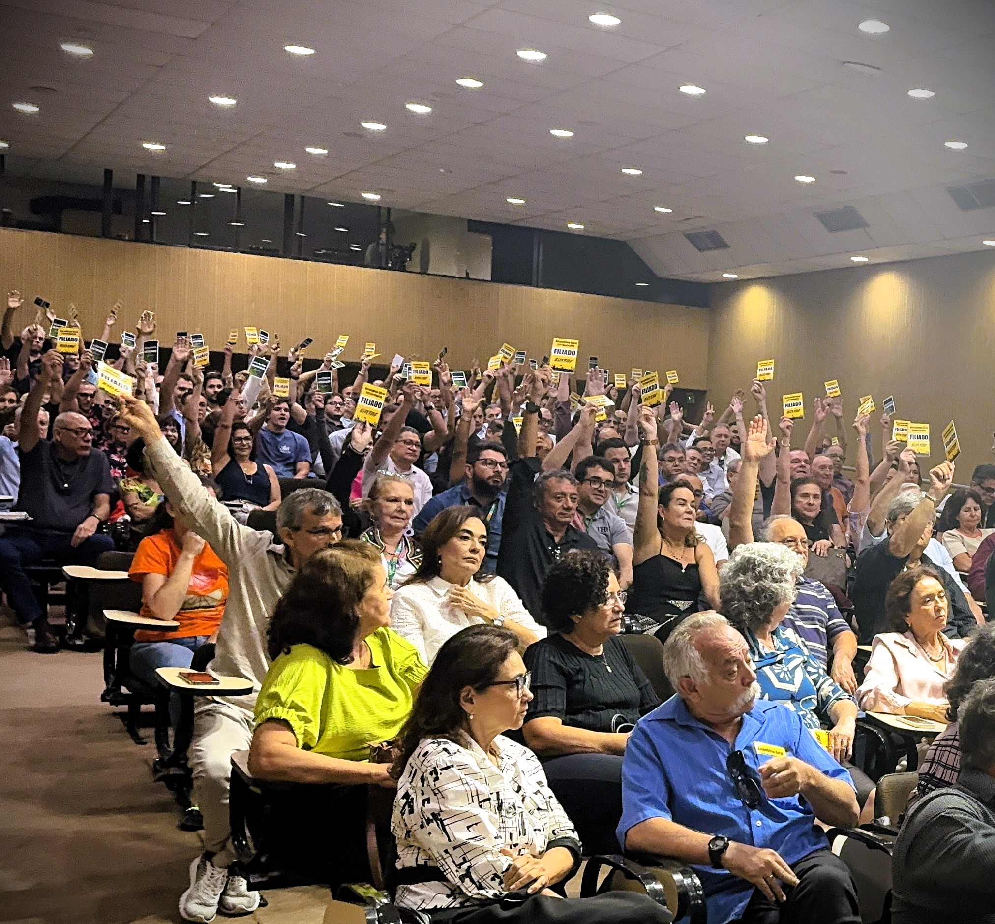 A Auditece realizou, nesta sexta-feira (17/04), Assembleia Geral Extraordinária (AGE), de forma simultânea à conduzida pelo Sintaf, reunindo os associados em formato híbrido para discutir e deliberar sobre pautas centrais para a categoria fazendária. A mobilização lotou o auditório da Sefaz, com a participação de centenas de servidores. As deliberações foram construídas de maneira conjunta entre as entidades, refletindo alinhamento de posições e atuação articulada em defesa dos servidores.